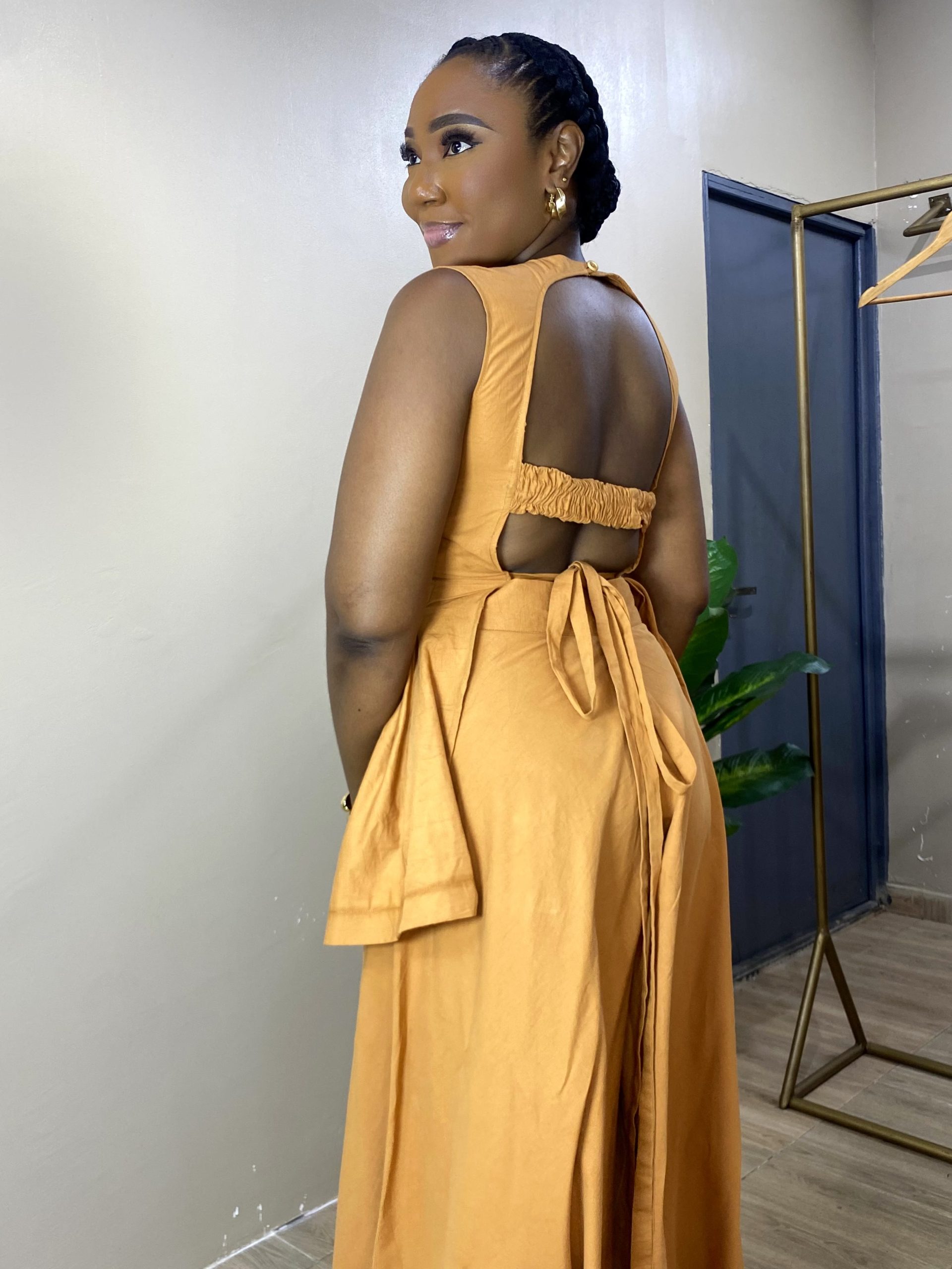 Rodiat is 5’9 and wearing Alafia dress in size 8