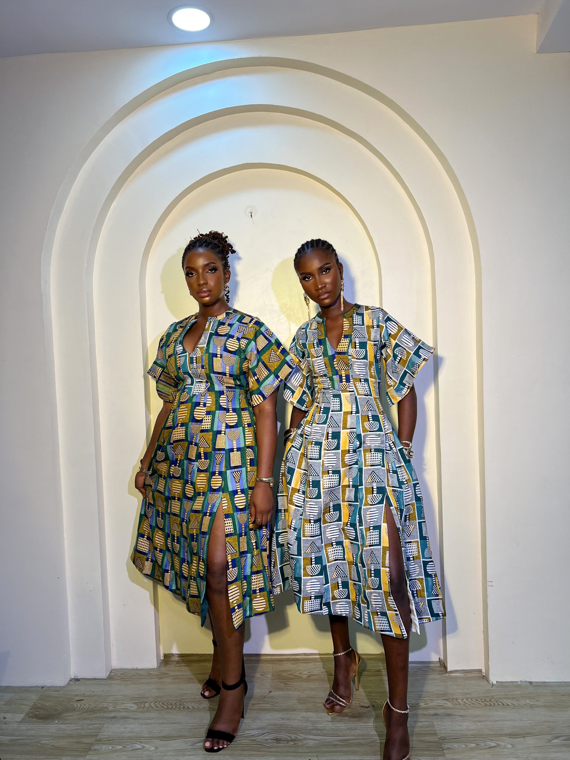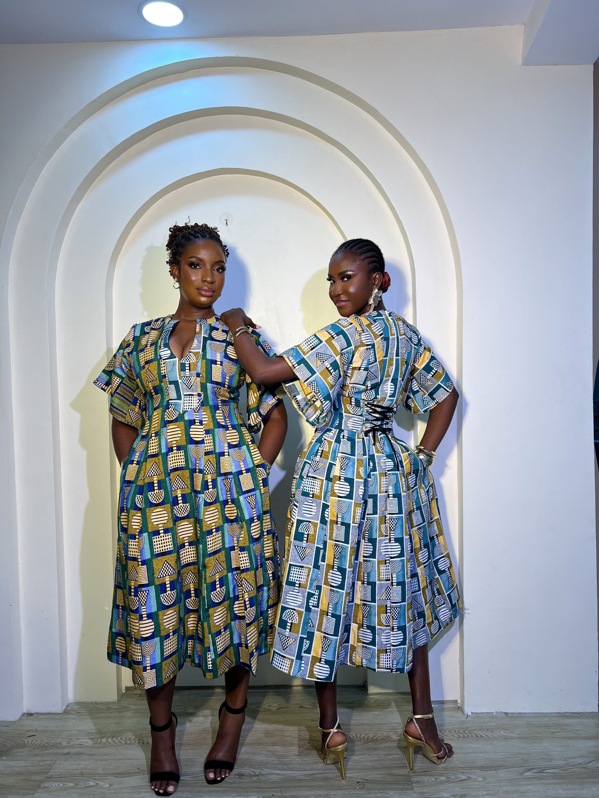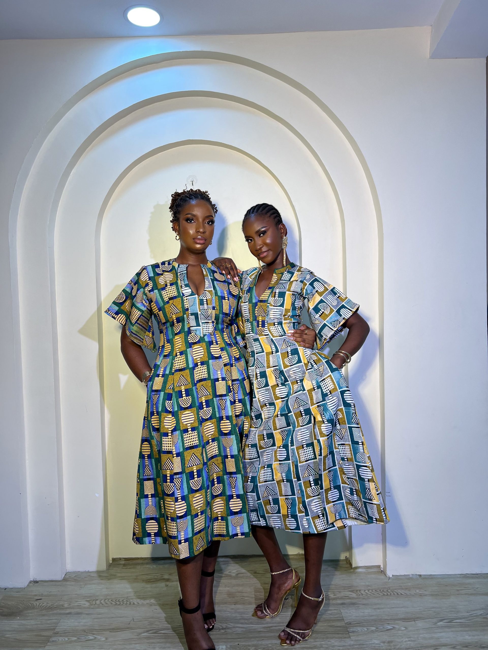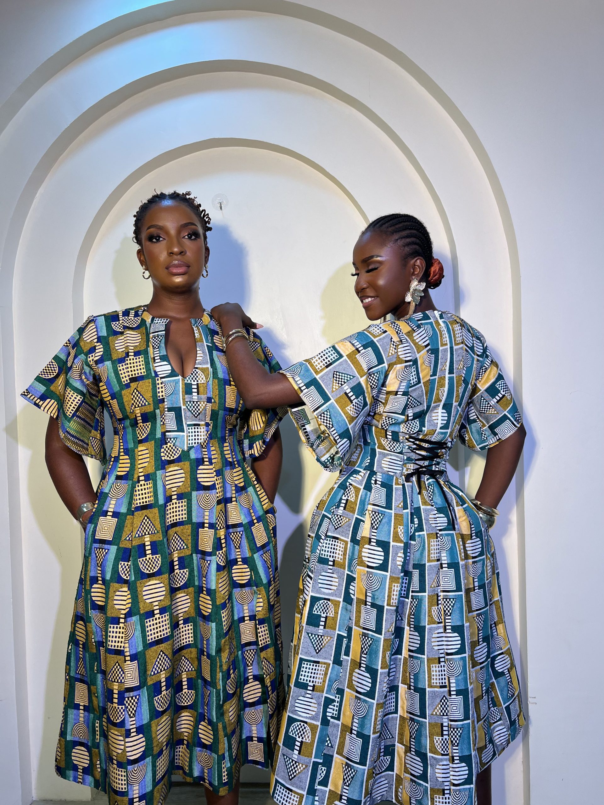 Models are both 5’9, Rodiat is wearing Masiri in white background while Fehintola is wearing Masiri in Emerald background